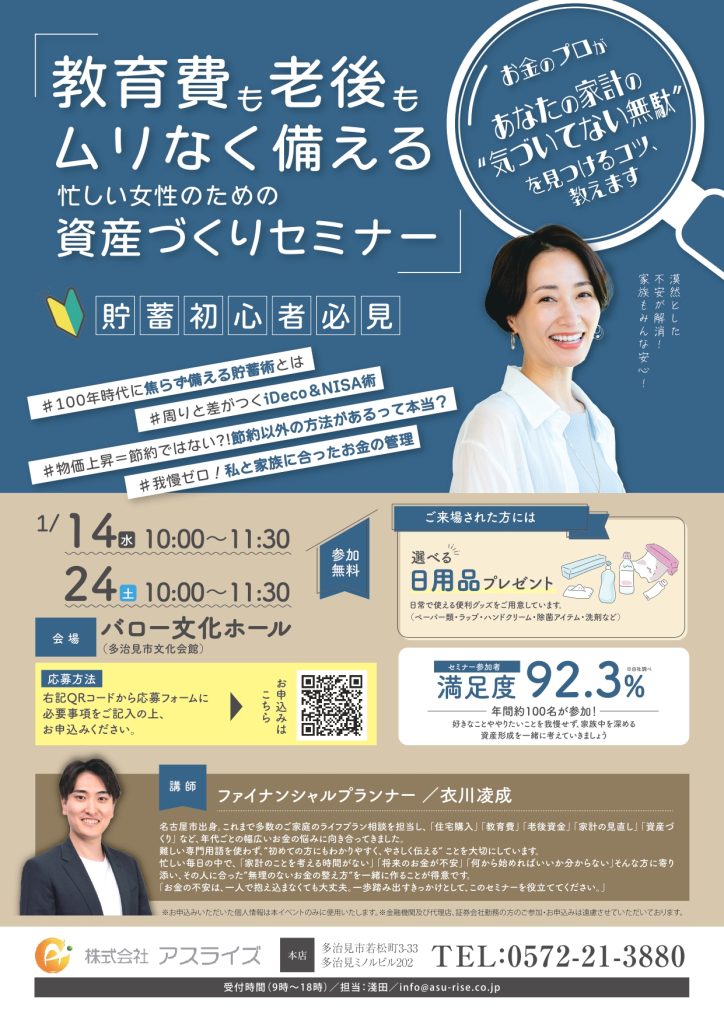 アスライズでは2026年1月に、”教育費も老後もムリなく備える忙しい女性のための資産づくりセミナー”を開催します。
